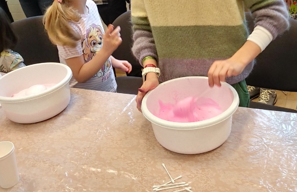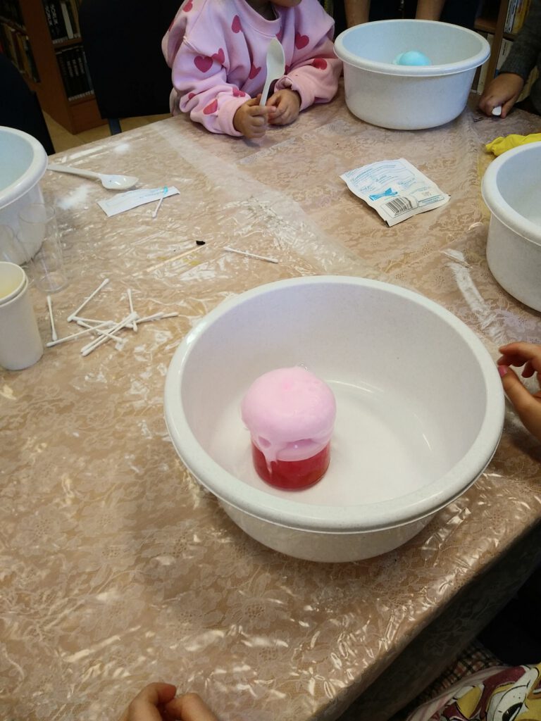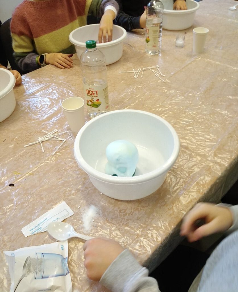 Kolejnym punktem programu był widowiskowy eksperyment chemiczny. Połączenie sody oczyszczonej z octem i kolorowym barwnikiem zamieniło się w efektowny „wybuch” wulkanu, który wzbudził zachwyt i salwy śmiechu. Eksperyment pozwolił dzieciom zrozumieć, czym jest reakcja chemiczna, a jednocześnie dostarczył niezapomnianych wrażeń wizualnych.