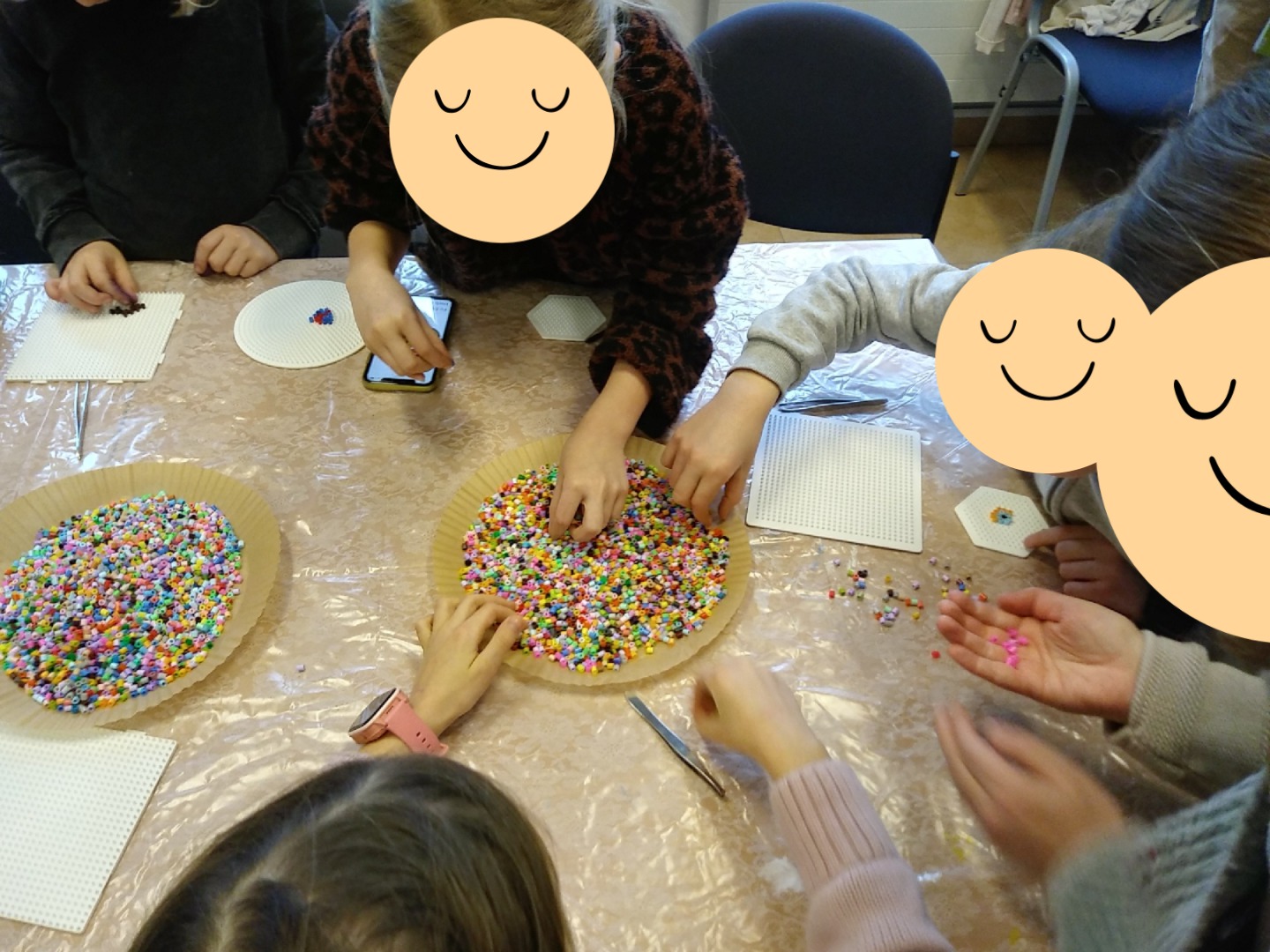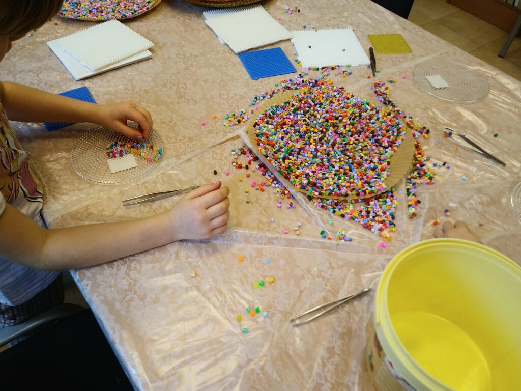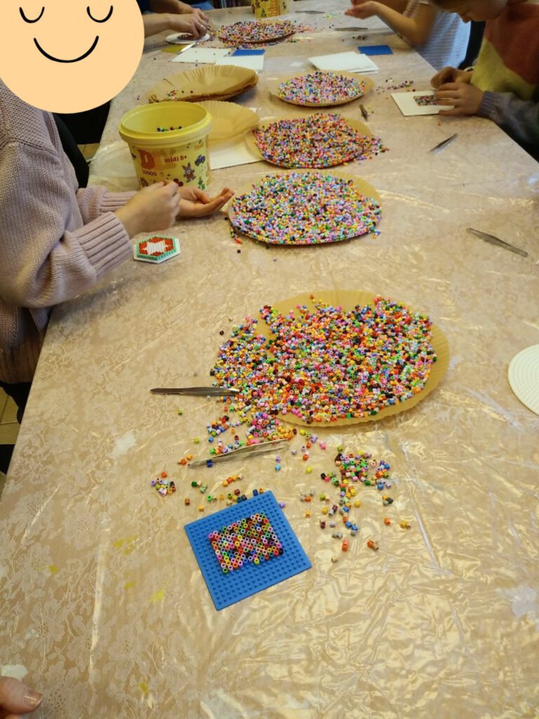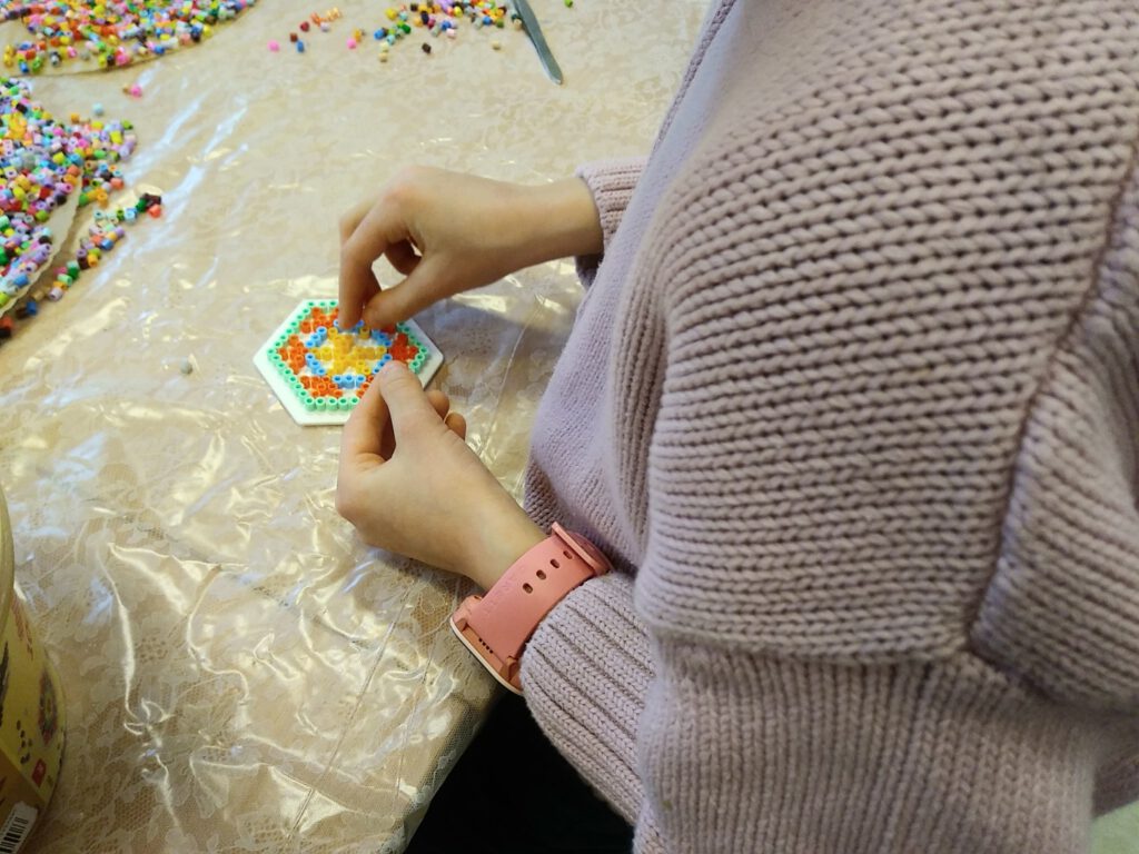 W drugiej części warsztatów dzieci miały okazję własnoręczne wykonać podkładki pod kubki z kolorowych koralików. Zajęcia rozpoczęły się krótkim wprowadzeniem, podczas którego prowadzący omówił materiały oraz zaprezentował przykładowe wzory. Następnie uczestnicy przystąpili do pracy, z dużym zaangażowaniem dobierając kolory i układając koraliki według własnych pomysłów. Dzieci wykazały się dużą kreatywnością, tworząc zarówno proste, geometryczne kompozycje, jak i bardziej skomplikowane, wielobarwne wzory. Podczas pracy ćwiczyły koncentrację, cierpliwość oraz zdolności manualne, a prowadzący służył pomocą i wsparciem w razie potrzeby.