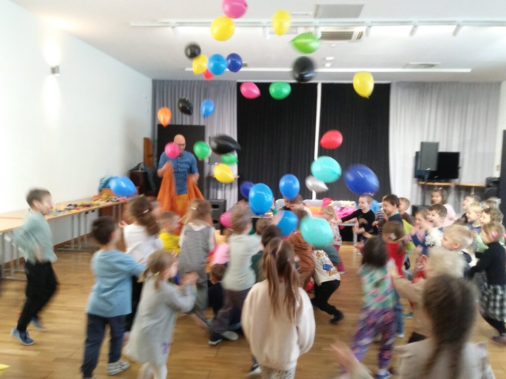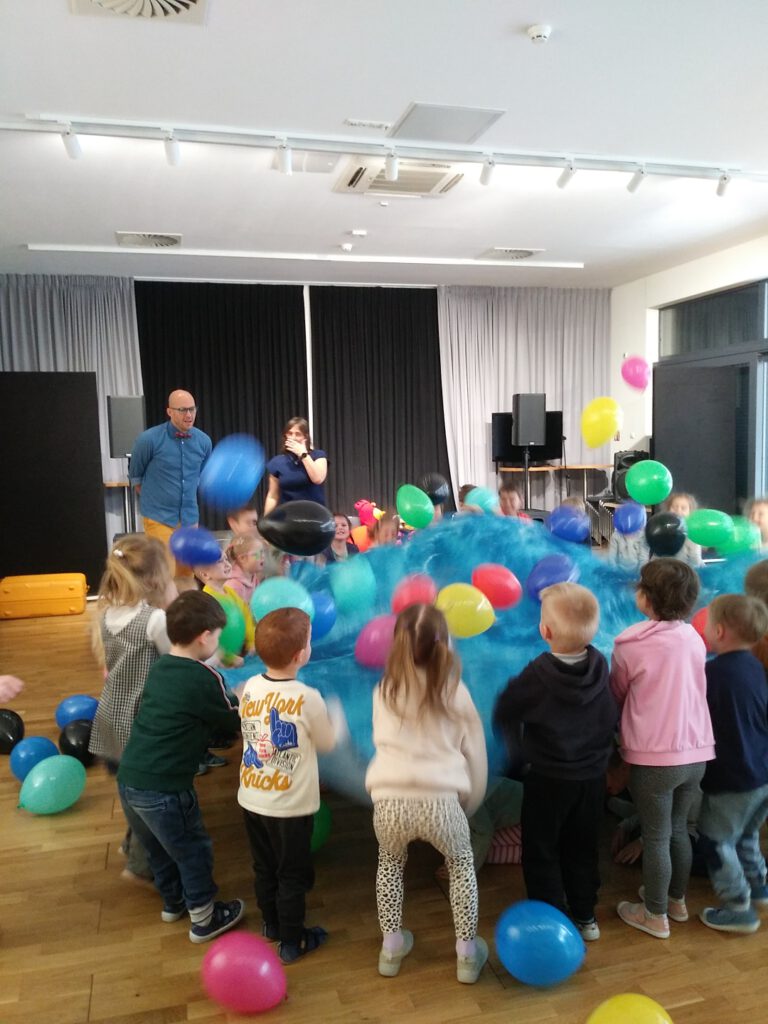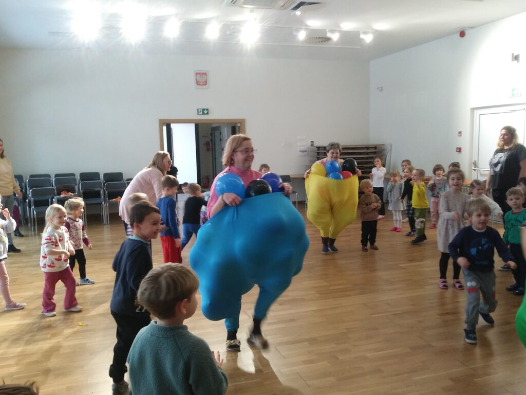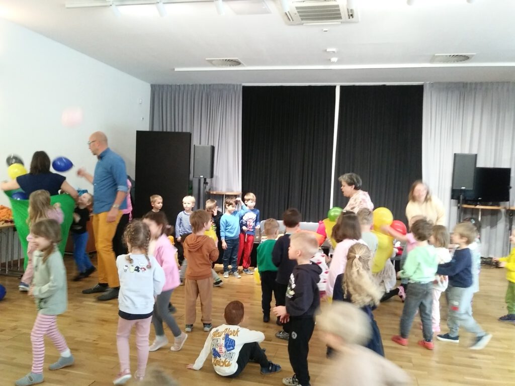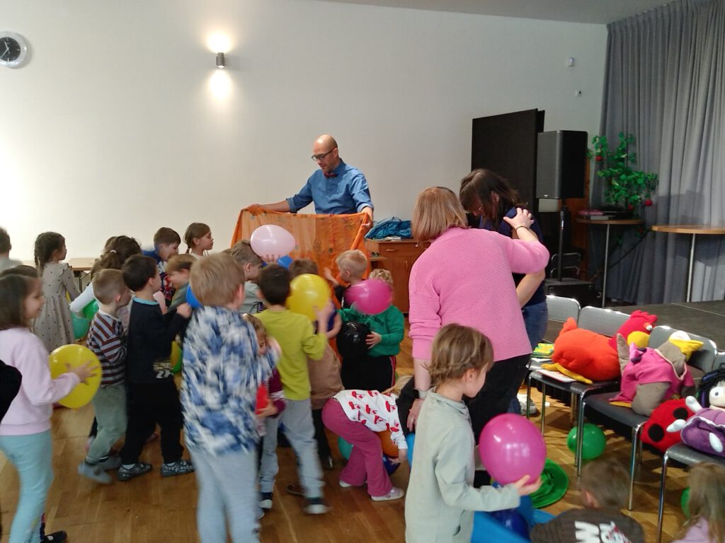 Dużo radości przyniosła także część zabawowa. Były elementy ruchowe, wspólne powtarzanie zabawnych rymowanek oraz krótkie scenki odgrywane przez dzieci. Spotkanie miało dynamiczny charakter i ani przez chwilę nie zabrakło uśmiechów.